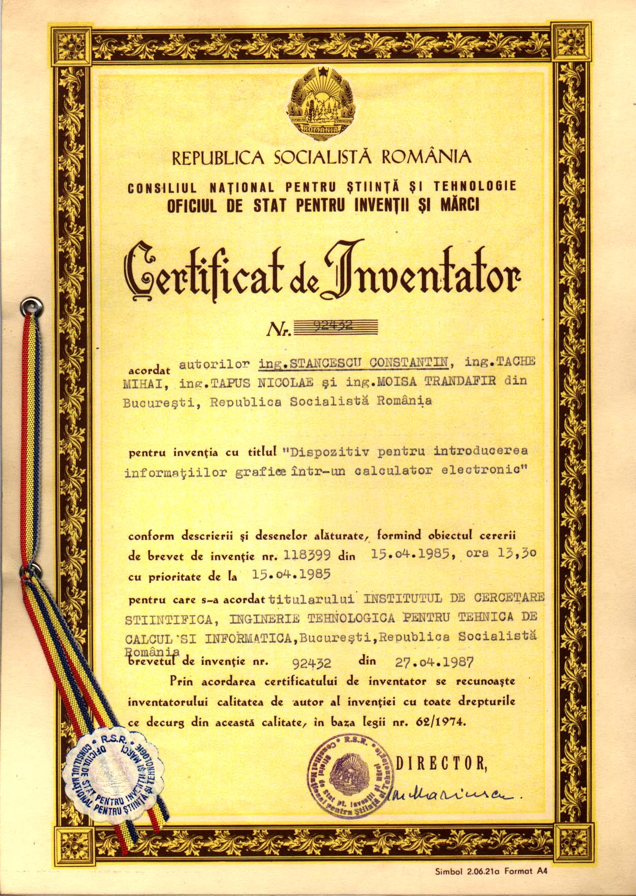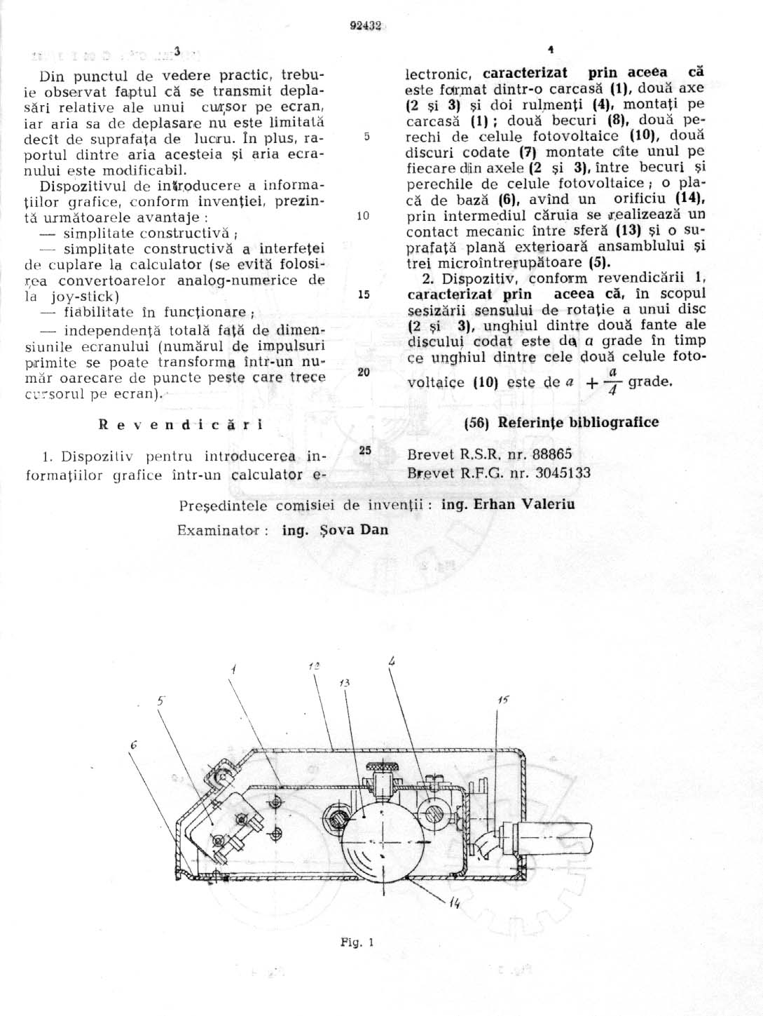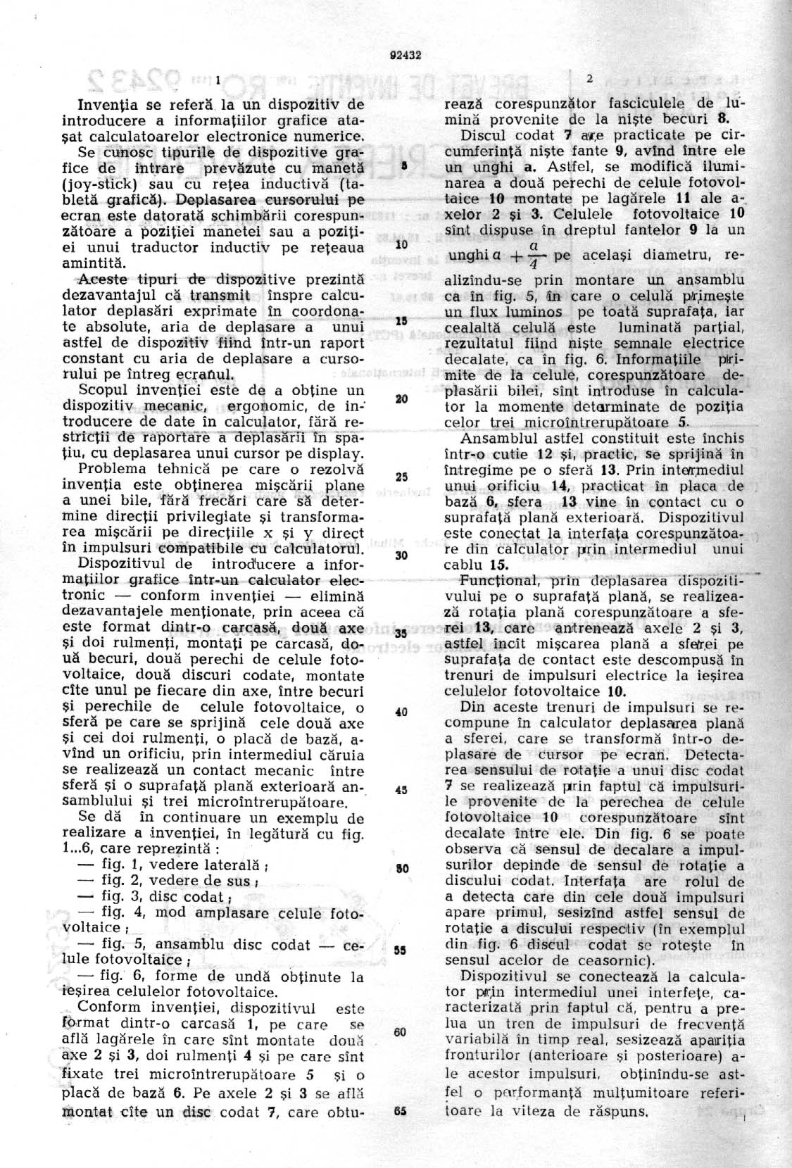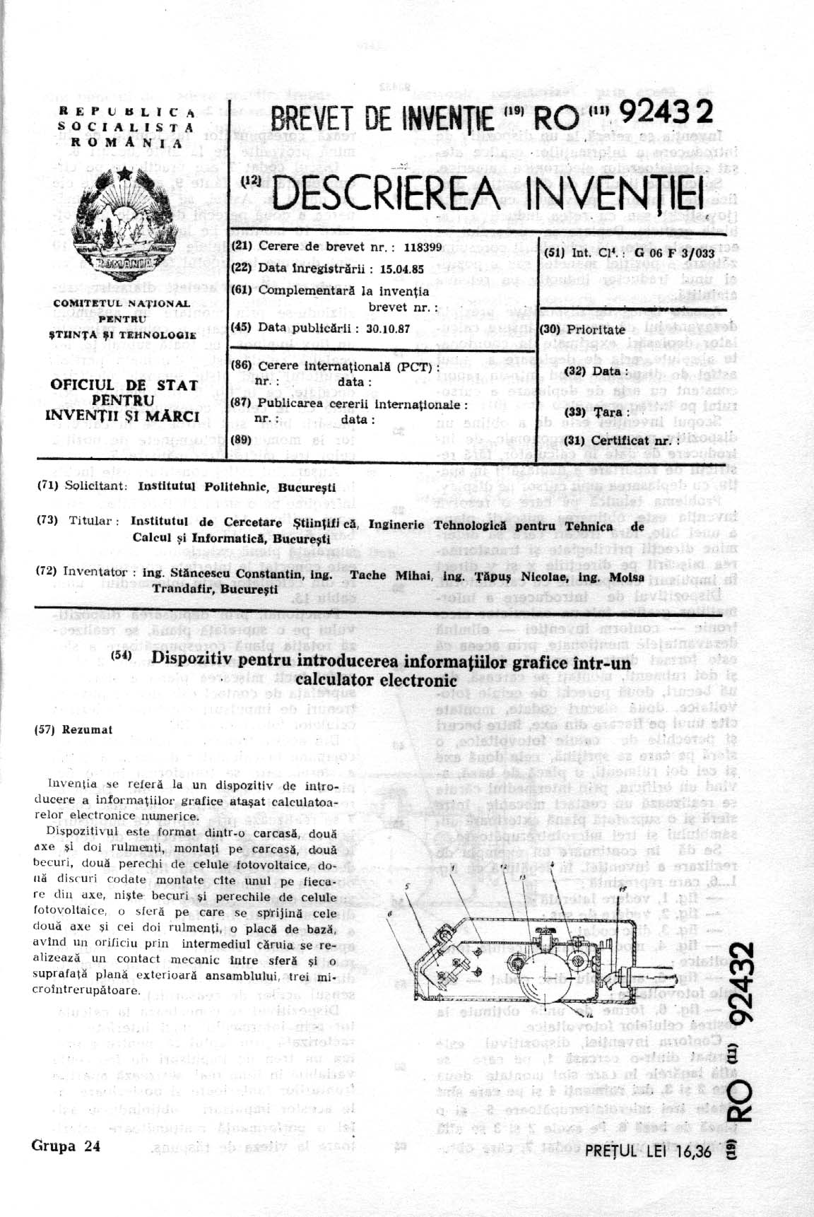 Titlul invenției este „Dispozitiv pentru introducerea informațiilor grafice într-un calculator electronic”, adică „mouse”, mai pe românește... Invenția a fost cesionată Institutului pentru Tehnică de Calcul și Informatică (ITCI) din București, fiindcă acesta era sistemul în acea vreme.
